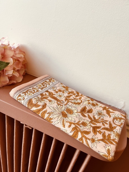 Chaque foulard est fabriqué à la main en Inde selon la technique artisanale du Block Print : une impression réalisée à partir de blocs de bois gravés et de pigments naturels.