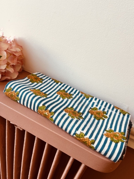 Chaque foulard est fabriqué à la main en Inde selon la technique artisanale du Block Print : une impression réalisée à partir de blocs de bois gravés et de pigments naturels.